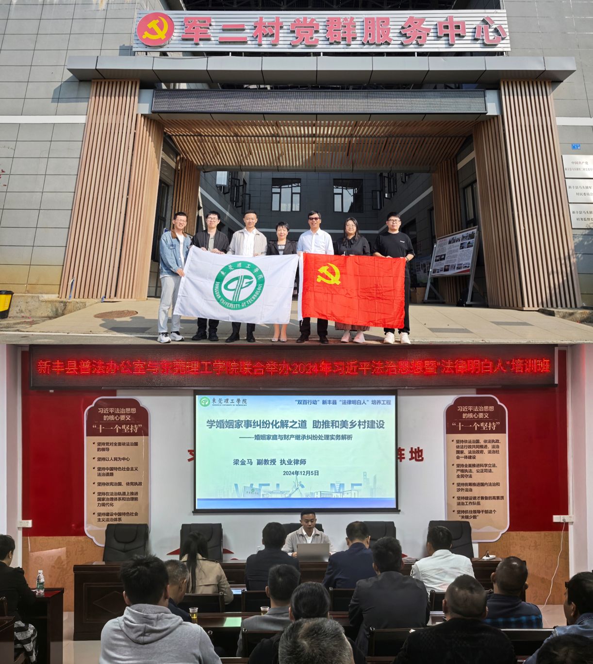 为发挥“百校联百县”助力“百县千镇万村高质量发展工程”行动效能,在法治轨道上大力推进法治乡村建设,12月5日,学校法治工作办公室联合法律与社会工作学院、学校法律顾问等,赴新丰县军二村与新丰县普法办公室共同开展第三期“法律明白人”培训,助力培育基层法治人才厚土。新丰县部分乡镇司法所相关负责人、村“两委”班子成员等50余人参加了培训。培训班由新丰县司法局党组成员、副局长朱秋景主持。